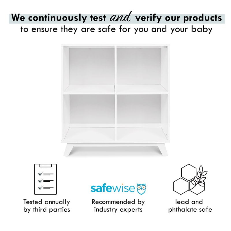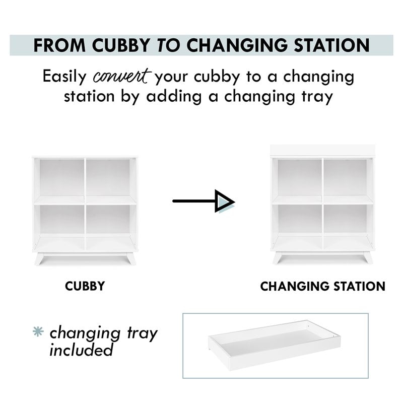 - Product Dimensions: 38\DURABILITY: 4 spacious cubbies that can hold all diaper changing needs. We've built this changing table with features like stronger shelf bottoms to make it sturdier and long-lasting,VERSATILE DESIGN: Changing station now. Big kid bookcase later! This changing table is designed so that you can remove the changing tray to use as a cubby bookcase after the baby years,QUALITY MATERIAL: Made of solid sustainable New Zealand pinewood and TSCA compliant engineered wood - only the best for your baby,FOR YOUR BABY'S SAFETY: Say goodbye to toxic chemicals! Finished in a non-toxic multi-step painting process and lead and phthalate safe,INCLUDED: Changing Table to Bookcase Conversion Kit & Anti-tip Kit