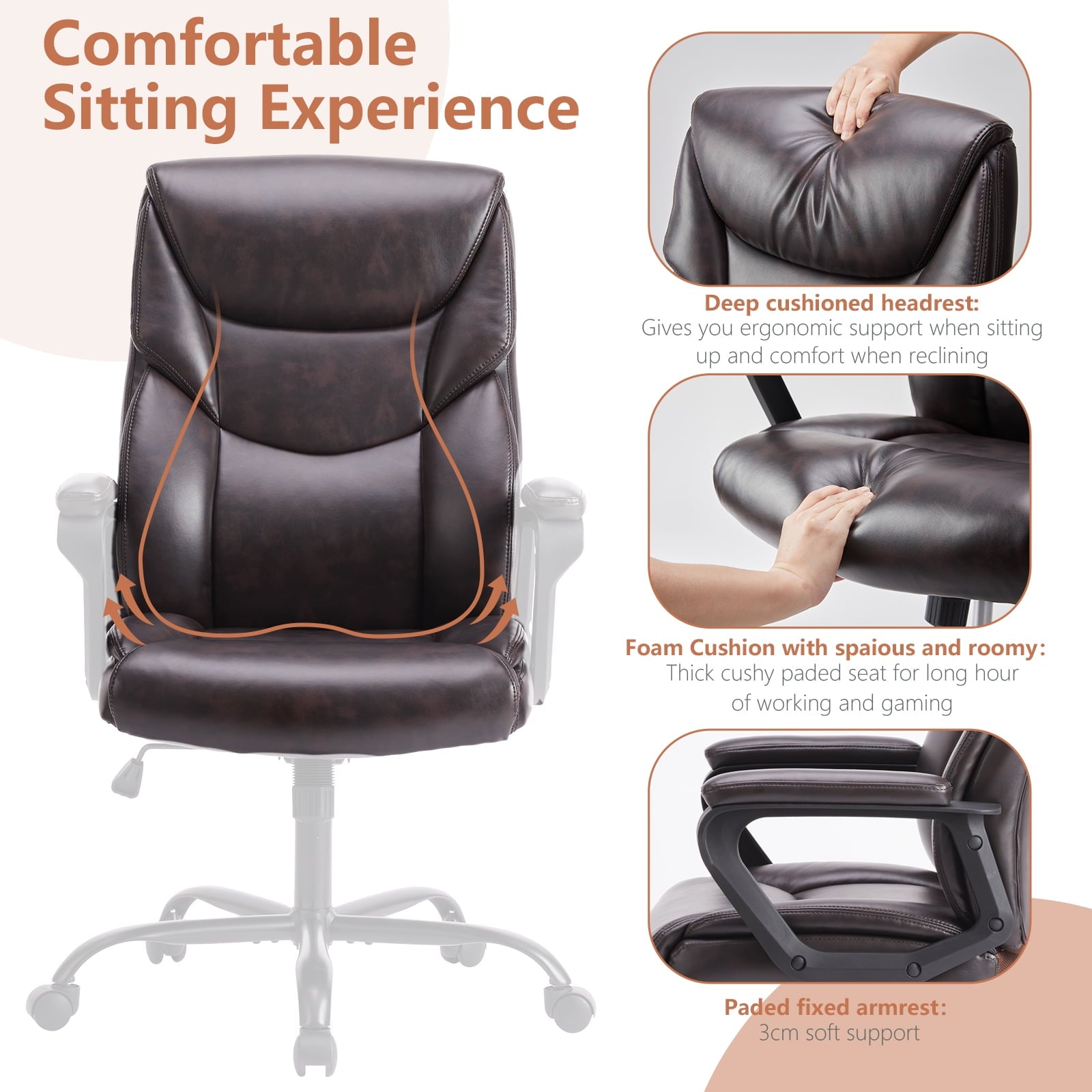 The Executive Office Chair with Ergonomic Design is the ultimate solution for relieving fatigue and ensuring optimal comfort during long work hours. With its upgraded design supporting the cervical vertebrae, this desk chair effectively reduces back and vertebrae pain. The segmented padded high back and seat, along with ultra cushioning, provide an unmatched comfort experience. This ergonomics office chair is truly the best choice for anyone who spends extended hours at their desk. Crafted with premium PU leather, the executive chair cradles your body in luxury. The double padded foam seat cushion and padded armrests not only offer a touch of elegance but also enhance your comfort. With a weight capacity of 275 pounds, you can sink into this chair in complete comfort and improve your work efficiency. It's the perfect combination of work and rest. The dimensions of this executive office chair are tailored to fit your unique body shape. With an adjustable height range of 18.11 to 21.85 inches, the overall height ranges from 40.55 to 44.48 inches. The 5-inch thick seat cushion ensures maximum comfort even during prolonged sitting sessions. Uncompromising on quality, this chair features a heavy-duty nylon wheelbase and 360-degree rolling wheels for flexibility and easy maneuverability in any office environment. The tilt function with position lock and 120-degree back adjustment further enhance the safety and comfort of this chair, making it ideal for home, office, and executive desks.Setting up this computer desk chair is hassle-free and quick. It comes with all the necessary hardware and tools, and the entire installation process can be completed in just 15-20 minutes following the instructions provided. Experience the perfect blend of style, comfort, and convenience with this executive office chair.