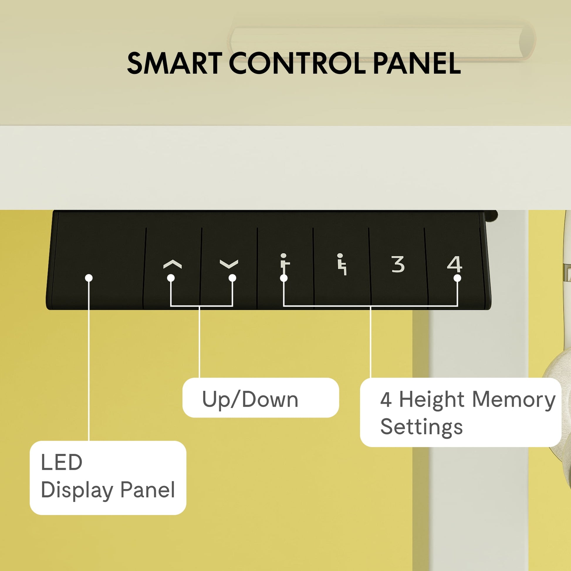 - Equipped with 6 buttons, including up and down adjustment, standing and sitting position presets, and two customizable height memory settings for effortless operation.