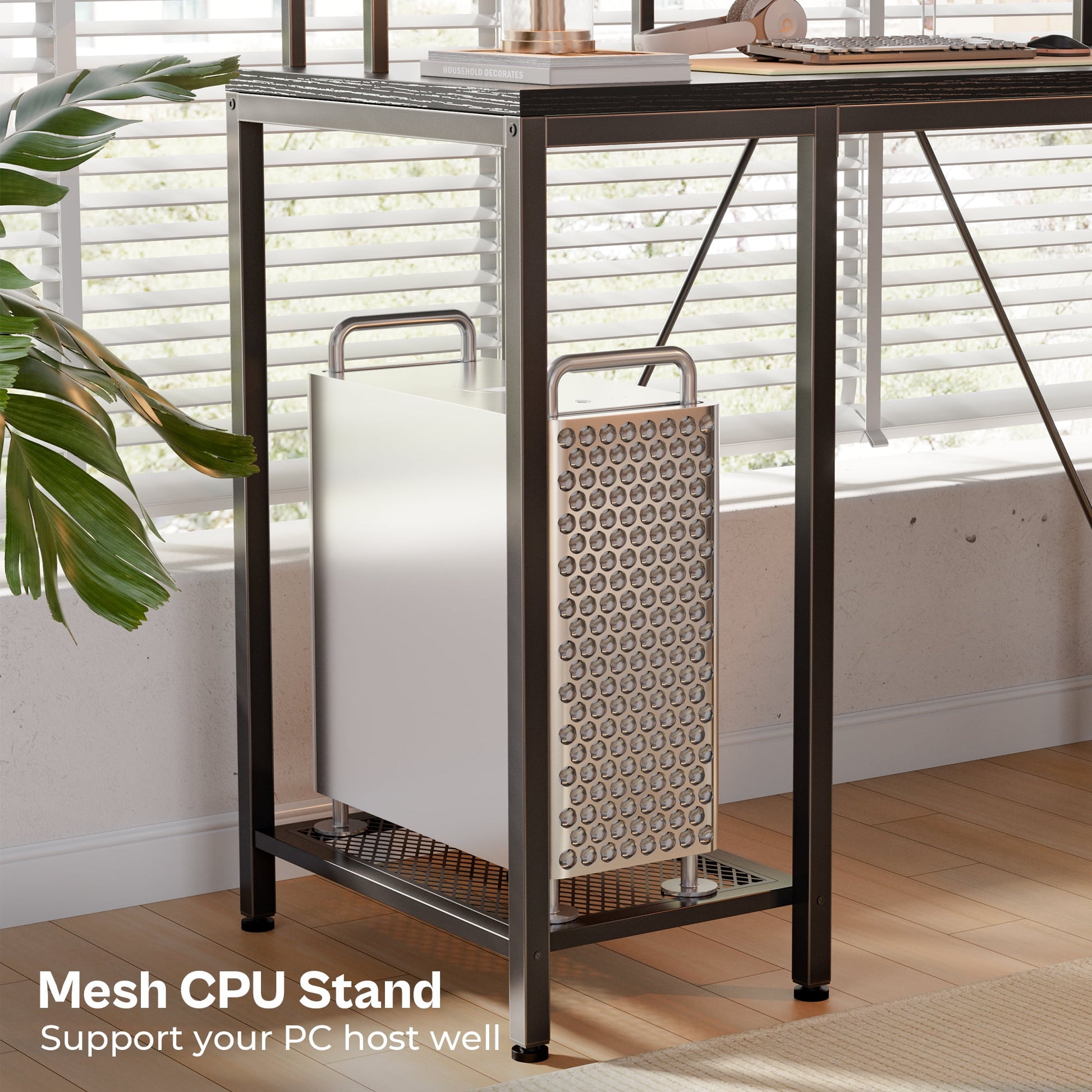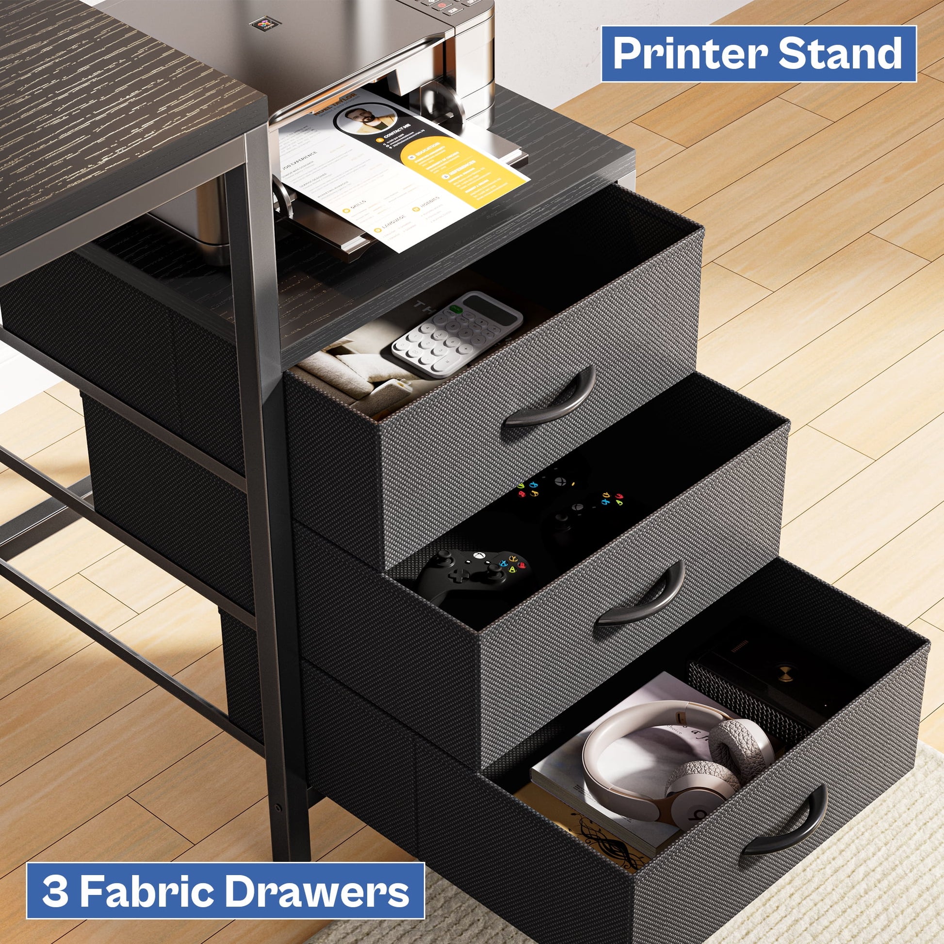 - More Refined Details: L shaped desk with 3 fabric drawers and a printer stand for organized storage. Mesh tower supports the CPU, and adjustable feet ensure stability and protect desktop items.