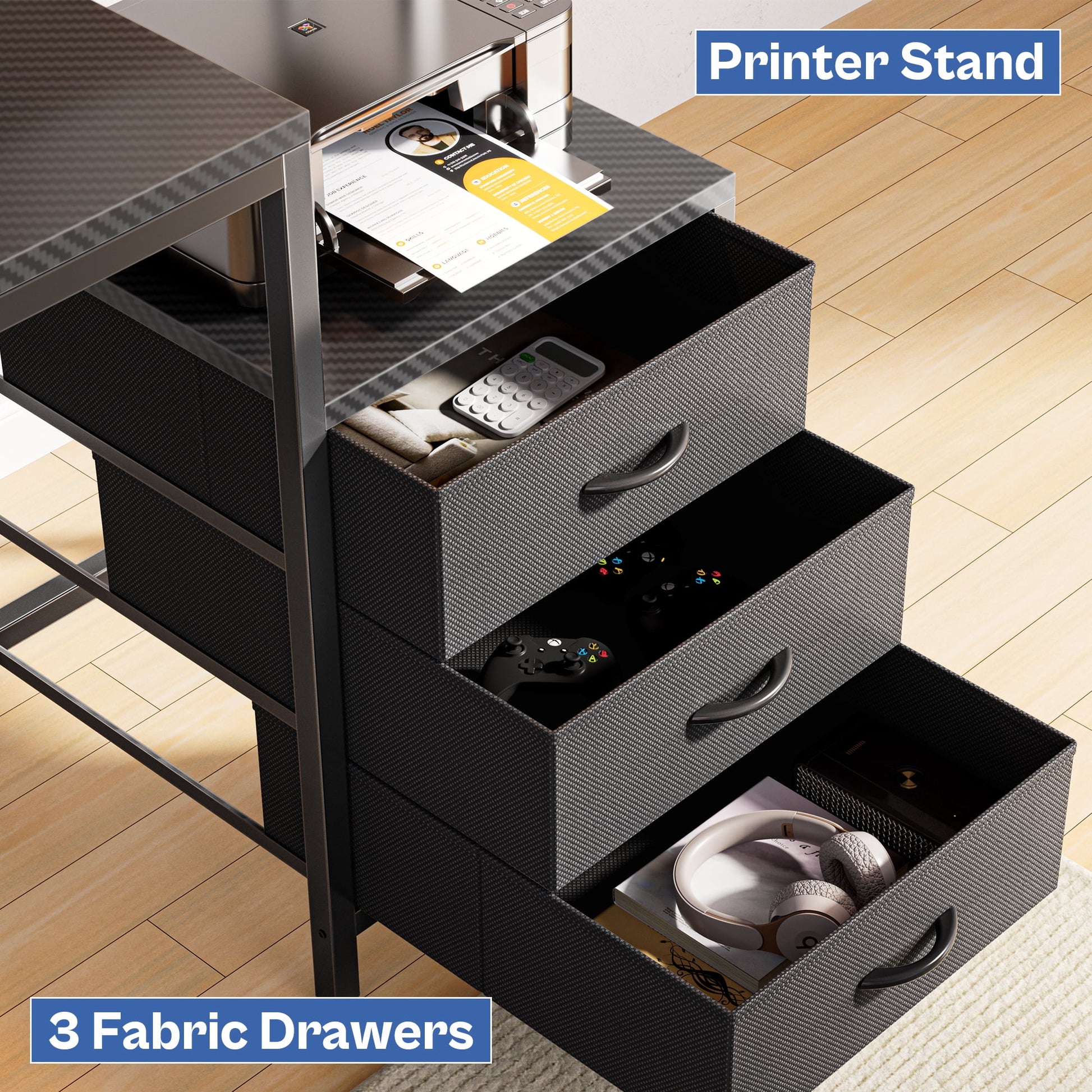 - Office Configuration: 3 Fabric Drawers & Monitor Stand & CPU Stand & Printer Stand